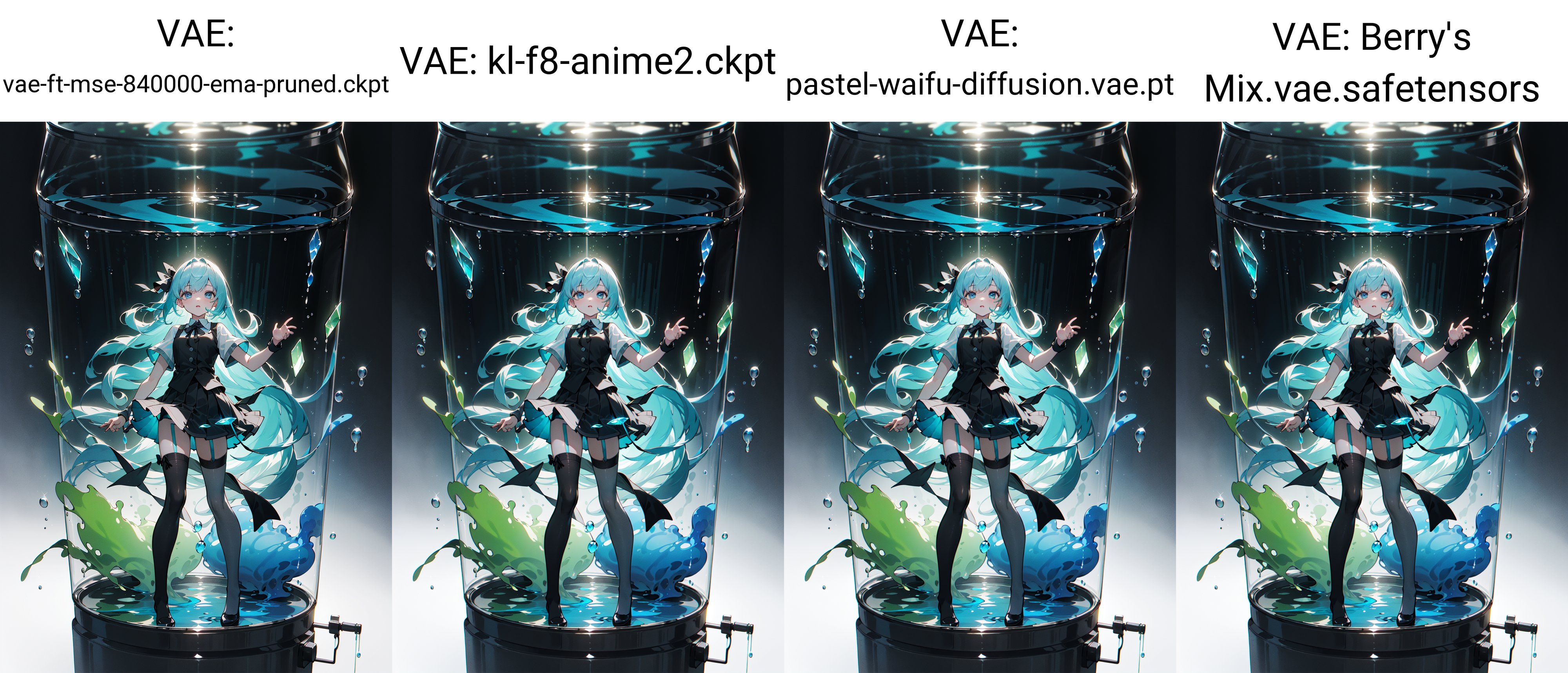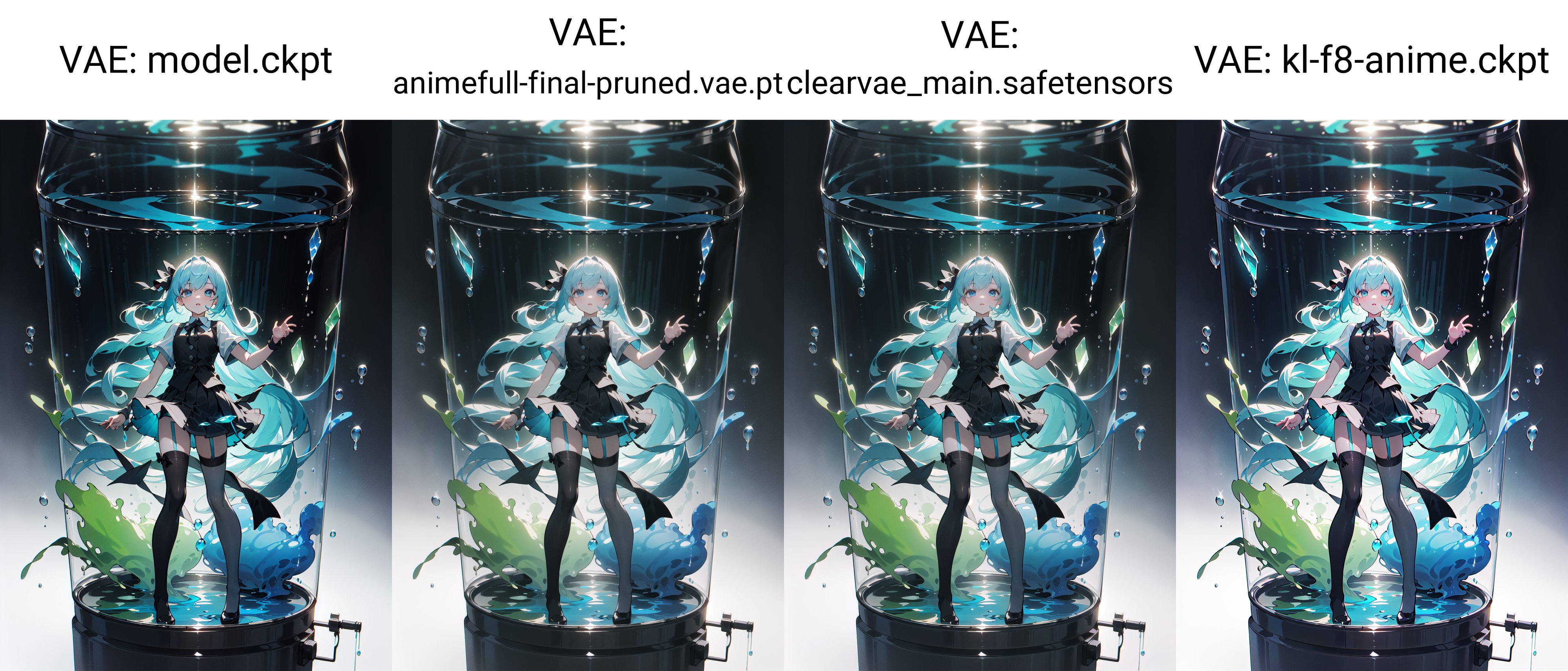 일반적으로 애니메이션, 만화 풍에는 kl-f8-anime2.ckpt을 실사풍 이미지 생성에는 vae-ft-mse-840000-ema-pruned이 많이 사용됩니다. 얼굴을 확대해서 보면 두 모델 간 노이즈 차이가 크게 보입니다. kl-f8-anime2와 같이 여러 개의 이름을 가진 VAE는 복제과정에서 네이밍이 바뀌거나, 저장소 이름과 파일명을 혼용하여 커뮤니티에서 사용하는데서 발생한 문제로 같은 VAE를 쓰면서 달라진 것 같이 느껴졌다면 큰 착각입니다.