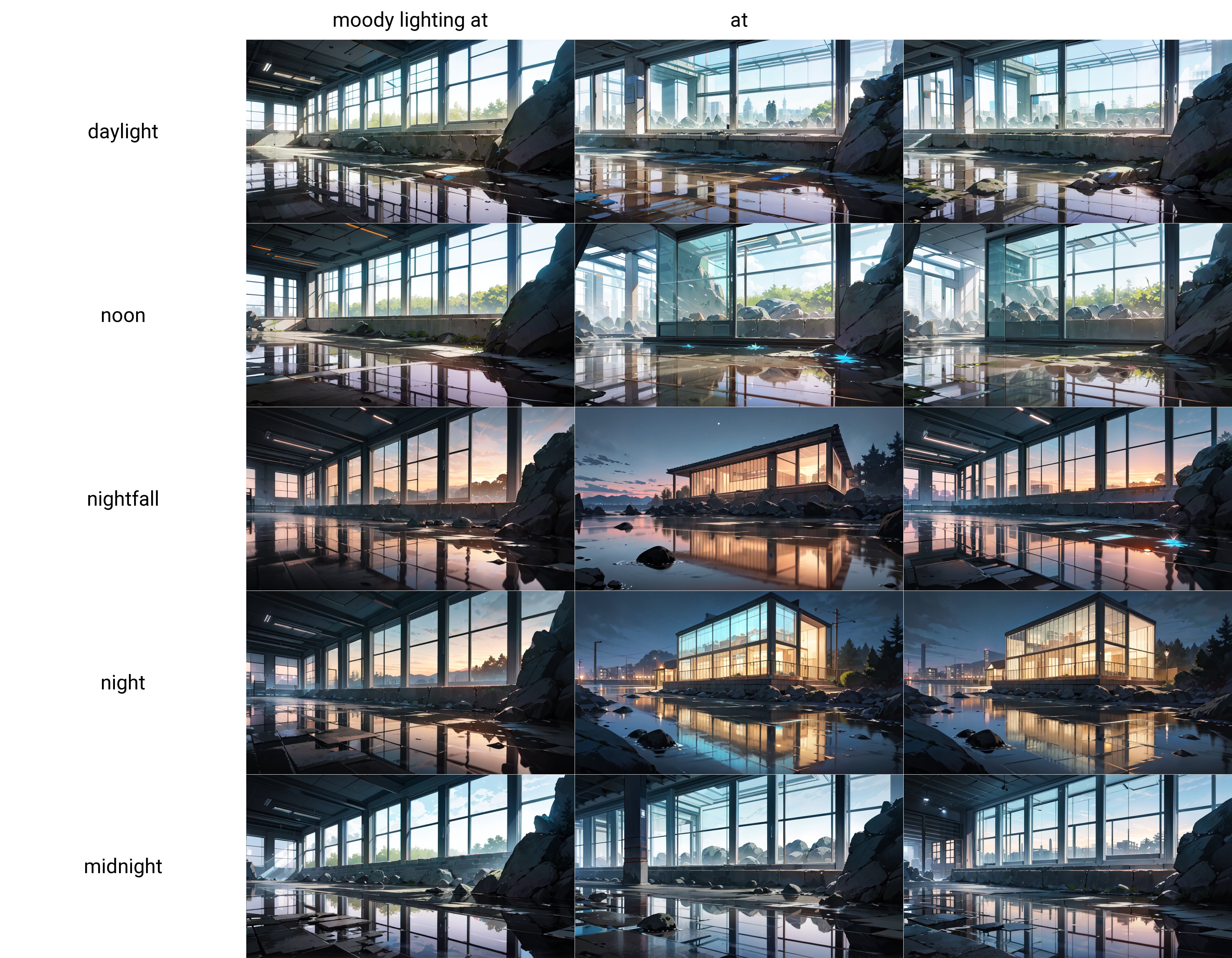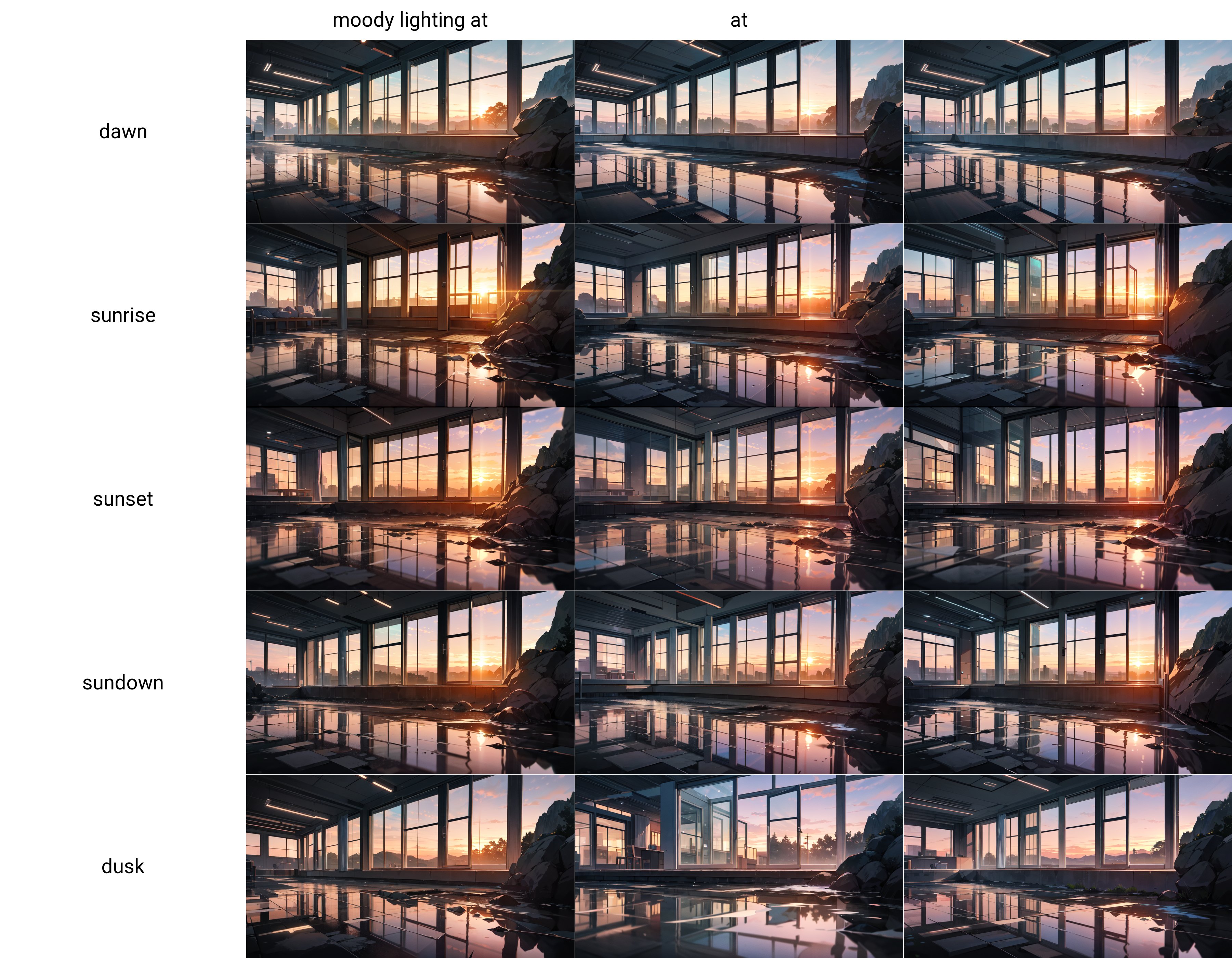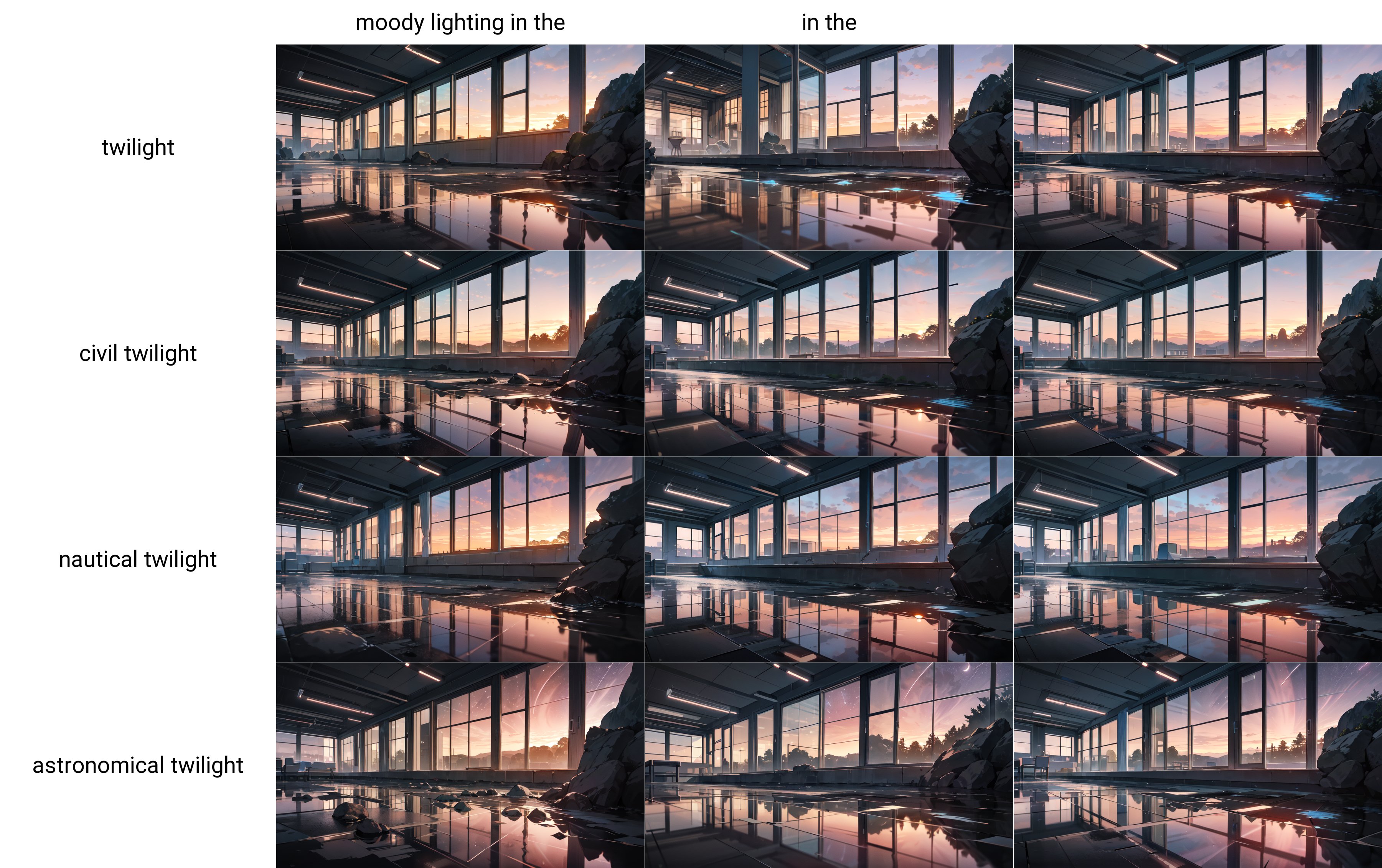 특히 야간 표현에 있어 전치사와 빛의 추가 표현 유무에 따라 큰차이가 나는 것을 확인할 수 있습니다. 밤과 자정은 거의 제대로 표현하지 못하고 있음을 잘 알 수 있습니다. 이는 학습 자료에 한계가 있기 때문이 아닌가 하는 추측이 됩니다. 이를 보완하기 위해서는 실내에서 어두운 외부를 보는 도시의 야경과 같은 키워드를 사용해 실내에서 바깥의 밤하늘을 표현할 수 있습니다.