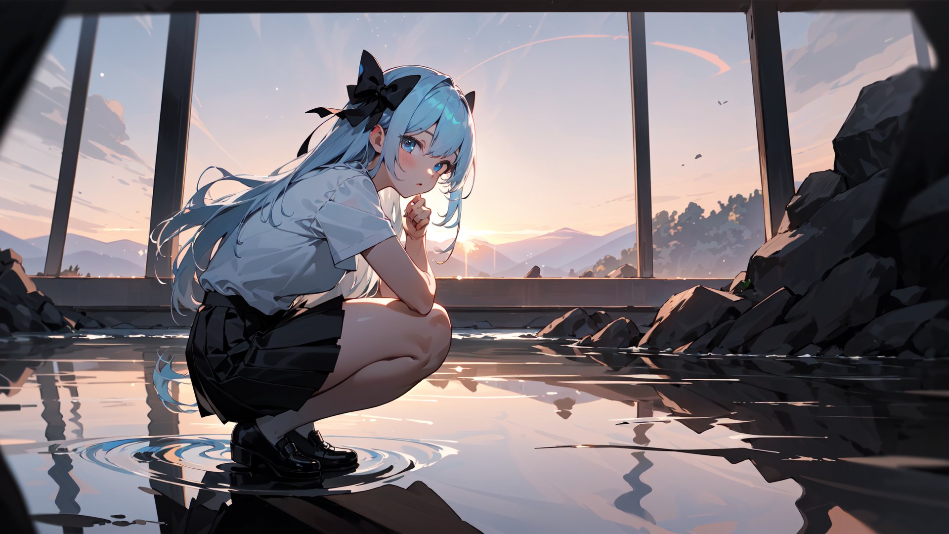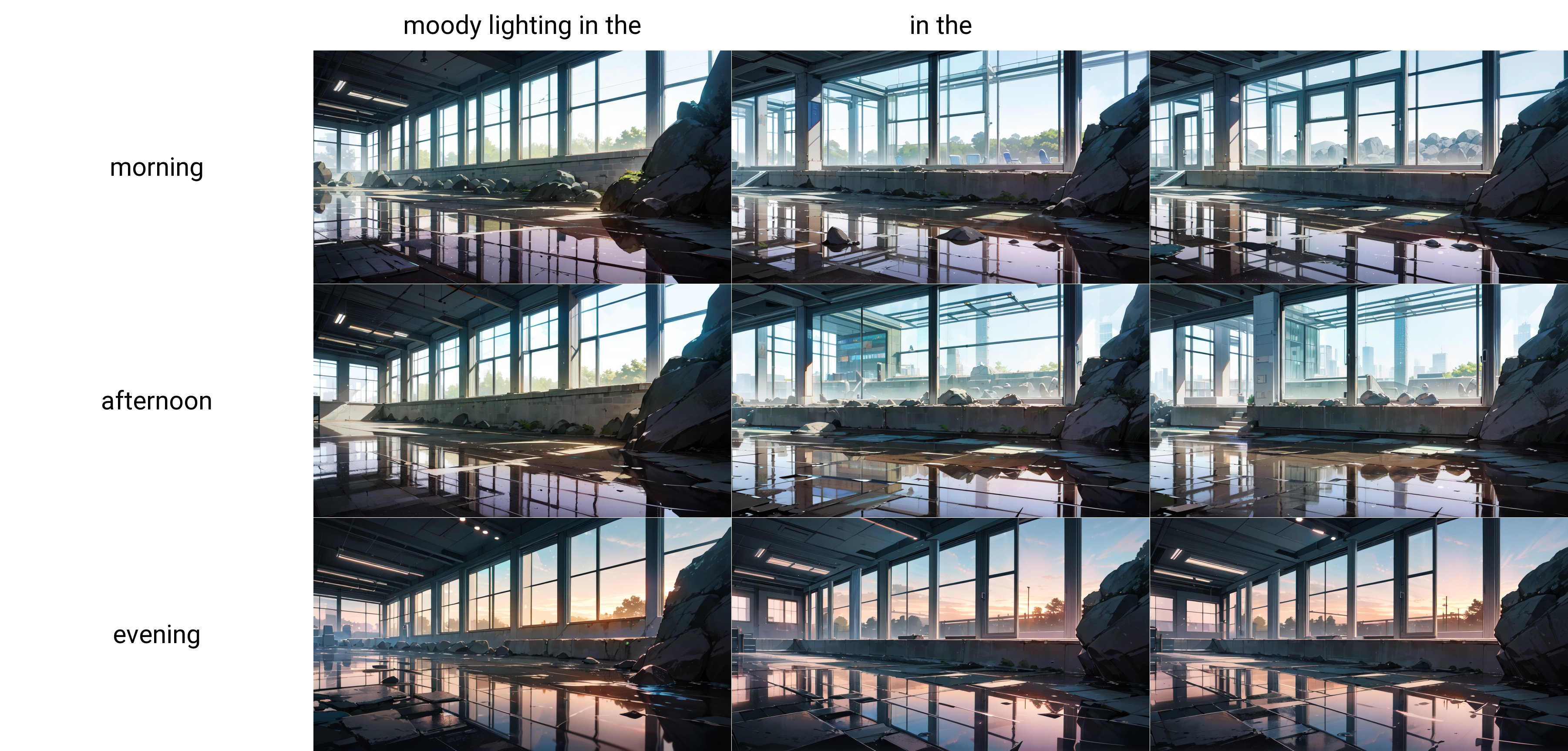 비슷한 원리로 별과 달, 어두운 밤하늘과 같은 키워드로 밤을 표현하는데 유용하게 사용할 수 있지만, 이 경우 해당 프롬프트들로 인해 강제로 실외로 장면이 전환되는 경우가 많습니다. 이러한 경향성을 잘 파악해서 적절한 키워드를 선택하는 것이 중요합니다. 이때문에 실내에서 바라보는 밤하늘을 순수한 프롬프트로 구현하는 것은 쉽지 않습니다.