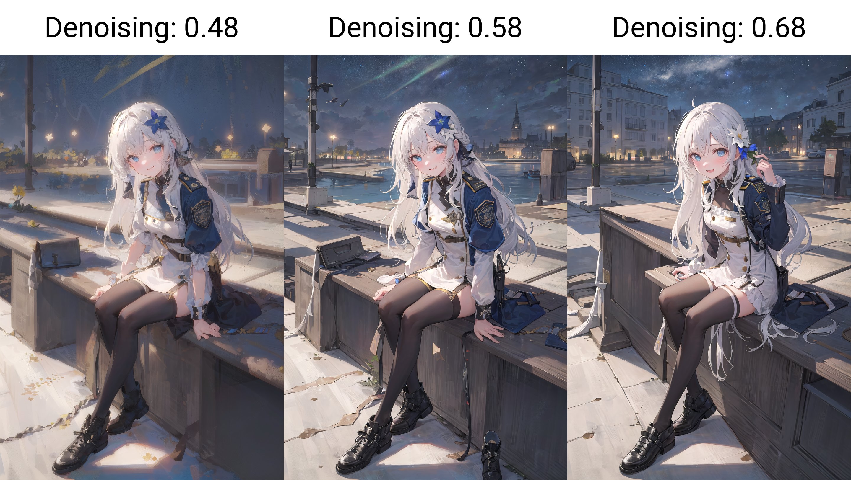 디노이징 스트렝스가 커질수록 노이즈가 추가되어(인공지능이 더 많이 개입해) 원본과 점점 다른 결과가 나오기 쉽다. 반면 디노이징 스트렝스를 낮추면 크기를 잡아늘린 빈공간에 노이즈를 추가하지 않았기 때문에 디테일과 화질이 저하된다.